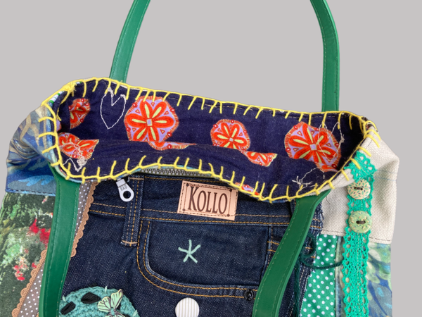 Deze kleurrijke tas is gemaakt van verschillende stofjes, met talloze applicaties, en heeft een zak van gebruikte denim met een rits.